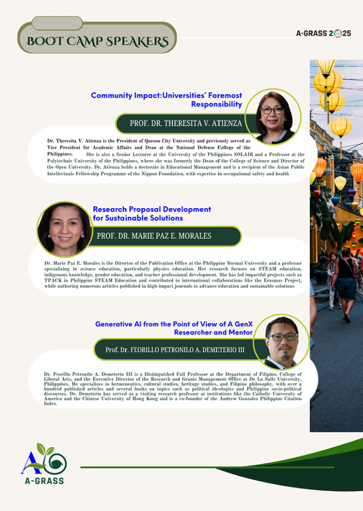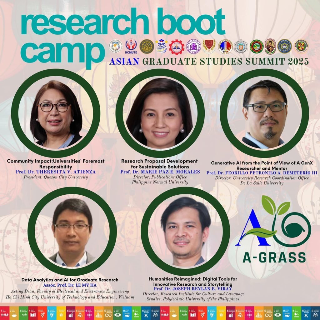 Dr. Theresita V. Atienza, Quezon City University (QCU) President, delivered a compelling talk titled “Community Impact: Universities’ Foremost Responsibility” during one of the Research Bootcamp Sessions at the Asian Graduate Studies Summit (A-GRaSS) 2025, held on May 21 at Ho Chi Minh City University of Technology and Education in Vietnam.