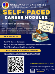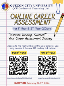 “Discover. Develop. Succeed.” The Quezon City University Guidance & Counseling Unit invites all 1st Year and 2nd Year QCians to take part in the Online Career Assessment, a student-centered activity...