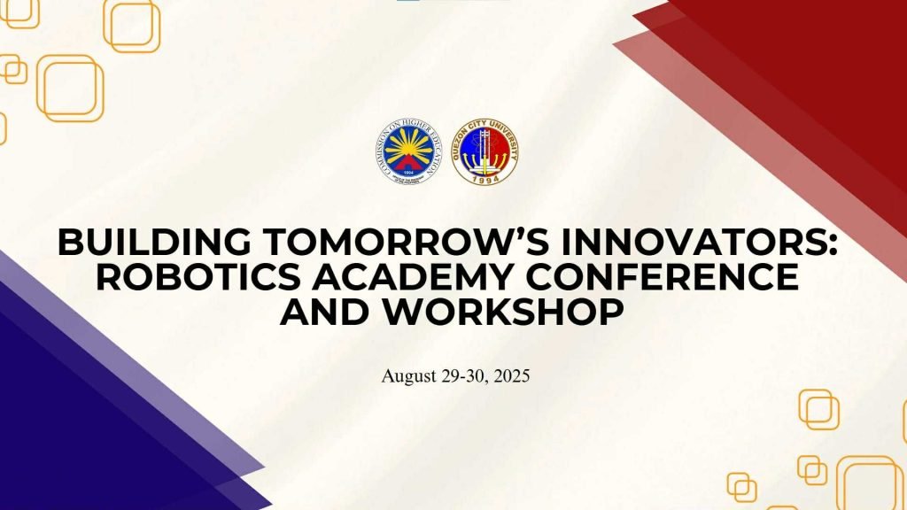 Quezon City University (QCU), in partnership with the Commission on Higher Education (CHED) and VEX Robotics, will host the Robotics Academy Conference & Workshops with the theme “Building Tomorrow’s Innovators” on August 29–30, 2025, at QCU San Bartolome Campus.