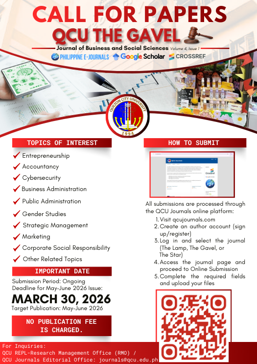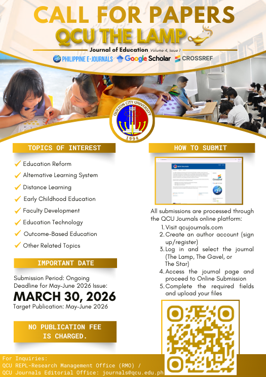 Quezon City University (QCU) invites researchers, faculty members, practitioners, graduate students, and independent scholars to submit original manuscripts for publication in Volume 4, Issue 1 of its peer-reviewed academic journals, scheduled for release in May–June 2026.