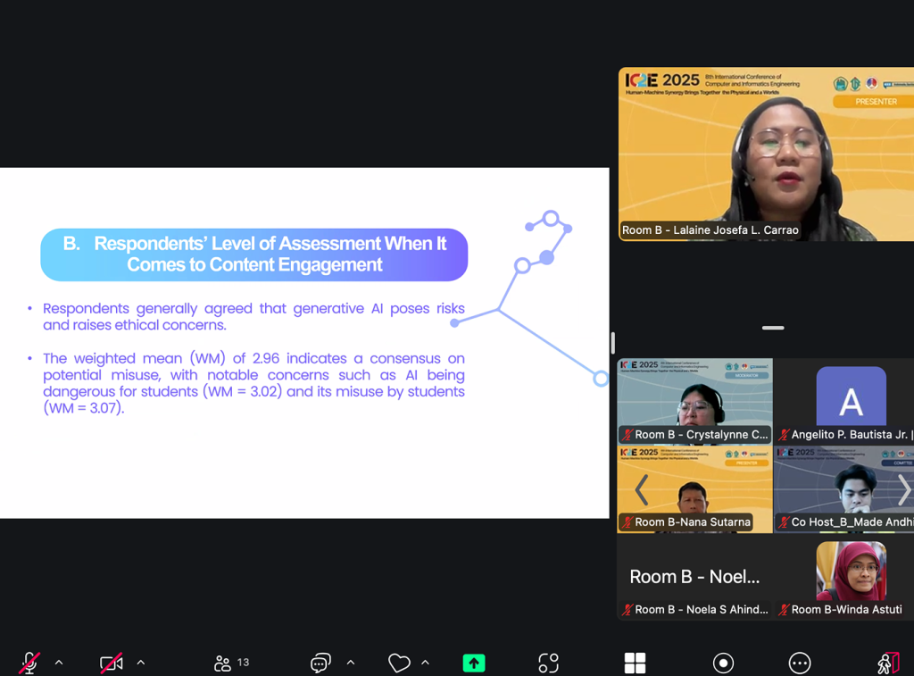 Representing the Philippine delegation, Dr. Isagani Tano, Dean of the College of Computer Studies (CCS), gave the welcome remarks. Meanwhile, Prof. Lalaine Josefa Carrao, in collaboration with Mr. Angelito P. Bautista Jr., presented their research paper, “Generative AI in Education: Risks, Acceptance, Trust, and Usage Among Selected Students in the Philippines.”